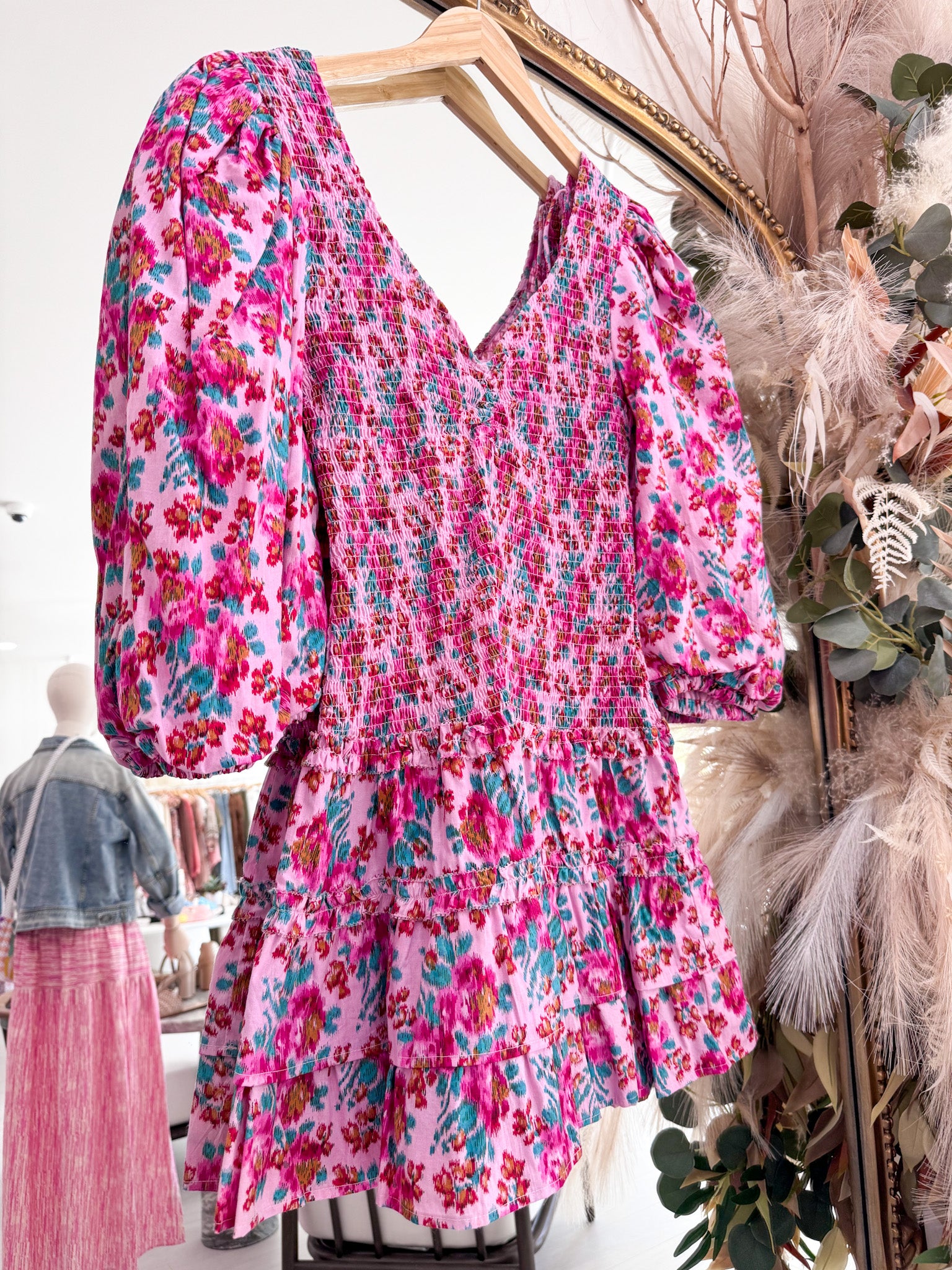 Our bestselling 100% cotton poplin mini-dress. A smocked bodice is accentuated by a puff sleeve and a-line skirt